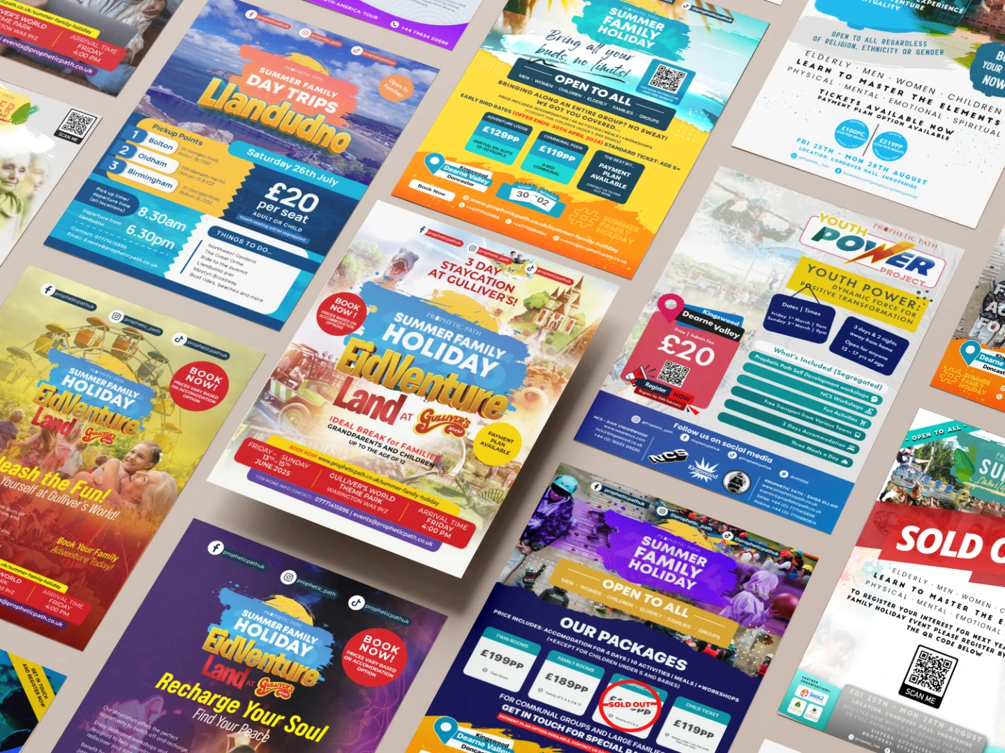 This case study brings together three large scale campaigns I designed and delivered, Summer Family Holiday, Youth Power Project and Soul Space Family Retreat. Each required a full suite of marketing collateral across both digital and print, with the goal of creating visually engaging campaigns that would connect with their audiences and communicate event details clearly.